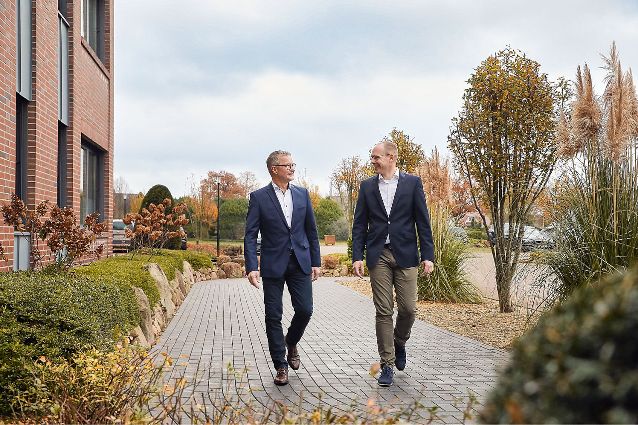 Der gemeinsame Weg zum Verwaltungsgebäude – in den vergangenen Monaten hat Andreas Büter (rechts) bereits an Vorstandssitzungen teilgenommen und sich von seinem Vorgänger Josef Mescher (links) einführen lassen.